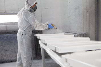 In deze installatie wordt de verf als poedervorm op het product aangebracht. Hierna worden de producten in een moffeloven gebracht waarin de poeder omsmelt naar een homogene laag. Afhankelijk van de toepassing van het product kunnen wij verschillende poedercoatings toepassen welke hun eigen specifieke eigenschappen hebben.